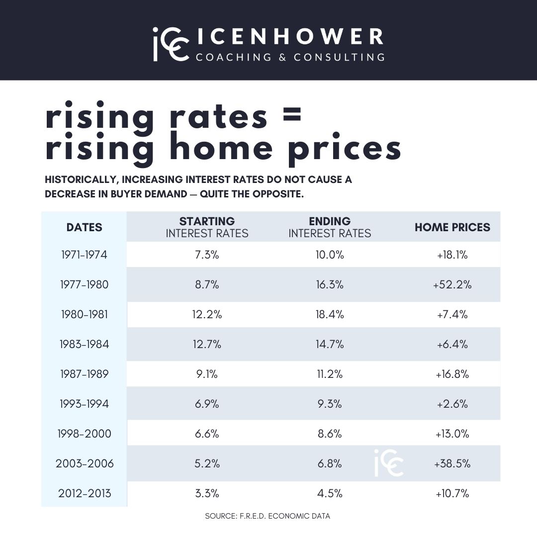 In our chart “Rising Rates = Rising Home Prices” you can learn some really interesting data that proves my point. Increasing mortgage rates do not cause a decrease in buyer demand – quite the opposite. If you look at each of these different time periods, you’ll see that home prices have increased regardless of interest rate increases. In fact, you’ll see that during time periods where interest rates jumped the most, housing prices jumped even more significantly.